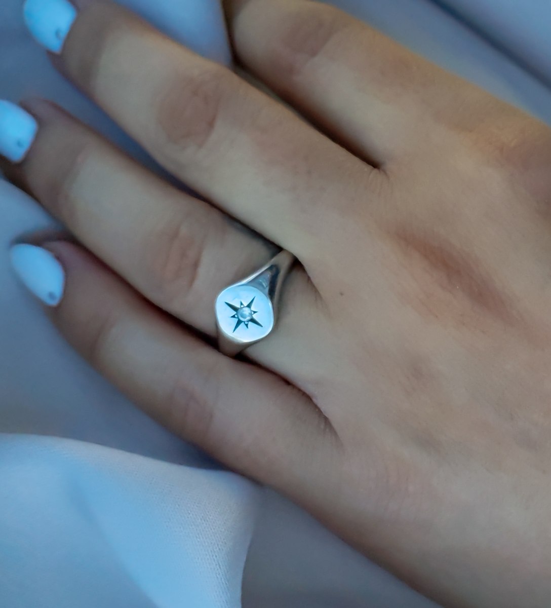 טבעת עשויה כסף 925 עם דוגמת כוכב וזרקון באמצע.